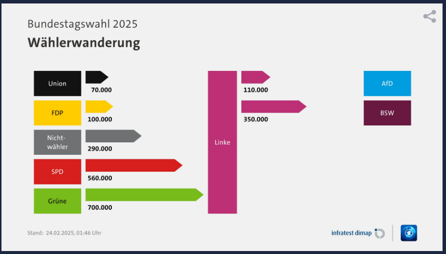 Die Linken haben einen extrem guten Wahlkampf im Internet gemacht, zum Beispiel bei TikTok der viele Jungwähler angesprochen hat. Und ich hoffe das machen die auch weiter so und überlassen die diversen Plattformen nicht den AfD-Typen.Der Zuwachs für die Linke liegt im Artikel klar an Merz.