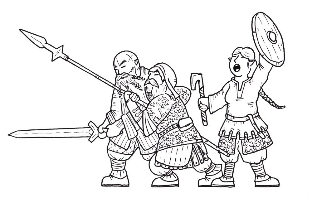 In der ersten Linie der Gruppe stehen unsere Kämpfer: (v.l.n.r.) Arvogar Kannison, Unni Stoibhopd und Khalinka Isenwever... da werde ich demnächst die restlichen Zwerge der "zweiten Linie" zeichnen und sie nach allen Ergänzungen in ein einziges, großes Bild zusammenfügen. Freue mich schon sehr auf das Endergebnis :kaw: